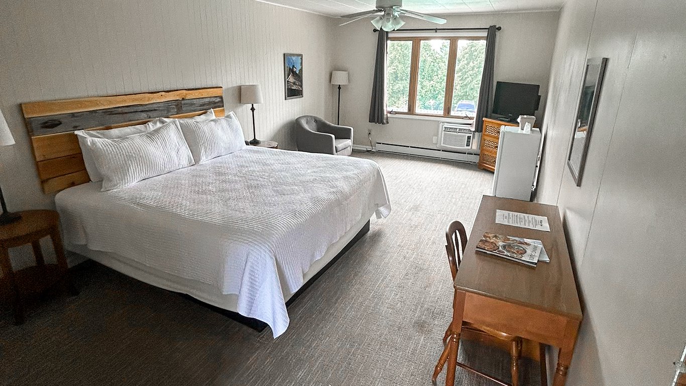 Enjoy a peaceful stay with a plush King-sized bed and calming views overlooking the property’s serene surrounding forest.